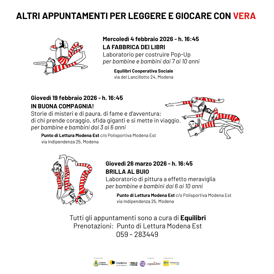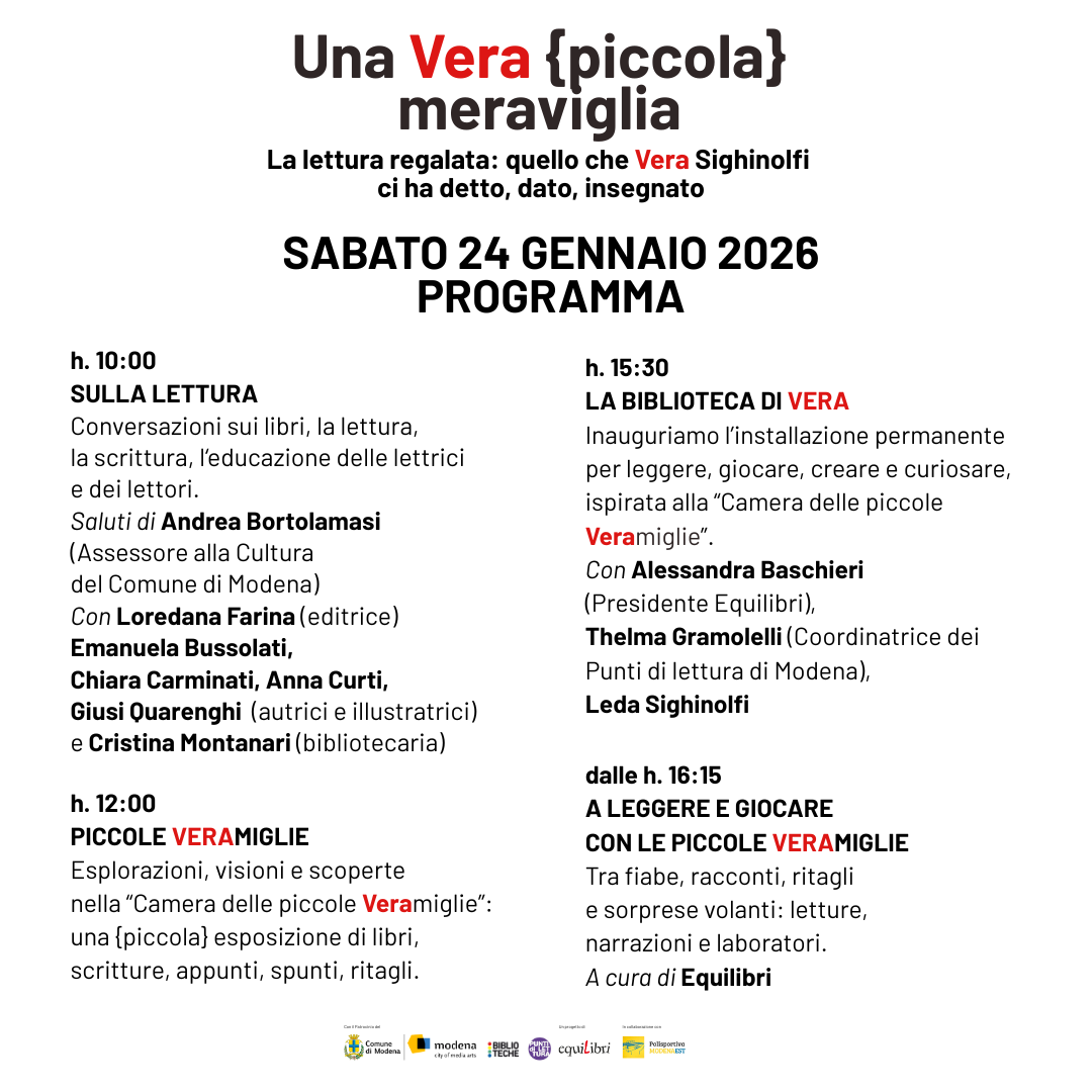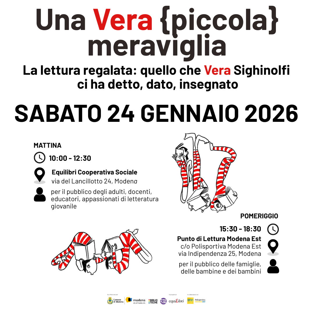Lo faremo a Modena, nella sede di Equilibri al mattino, in Via del Lancillotto 24, a pochi minuti di passeggiata dalla Stazione ferroviaria (per chi arrivasse in treno); con parcheggio nelle vicinanze (per chi arriverà in auto). Al pomeriggio continueremo al Punto di lettura Modena Est, che è anche punto di memoria di quando Vera, nella biblioteca di Modena Est, iniziò il suo lavoro con i libri, i bambini e le bambine. Alle bambine e ai bambini di oggi, alle loro famiglie, dedicheremo il pomeriggio, leggendo, giocando, parlando di Veramiglie.