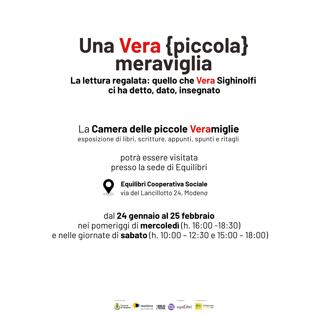 Noi, invece, vi scriviamo da questa pagina per invitarvi a Modena il 24 gennaio 2026, sabato, a chiacchierare di libri, di biblioteche e punti di lettura, di lettrici e di lettori, e di lei, la nostra amica. Chi da tanto tempo conosce Equilibri, forse ha conosciuto Vera. Chi non l’ha conosciuta avrà modo di scoprire che, senza di lei, Equilibri forse non ci sarebbe stato, o sarebbe stato diverso.